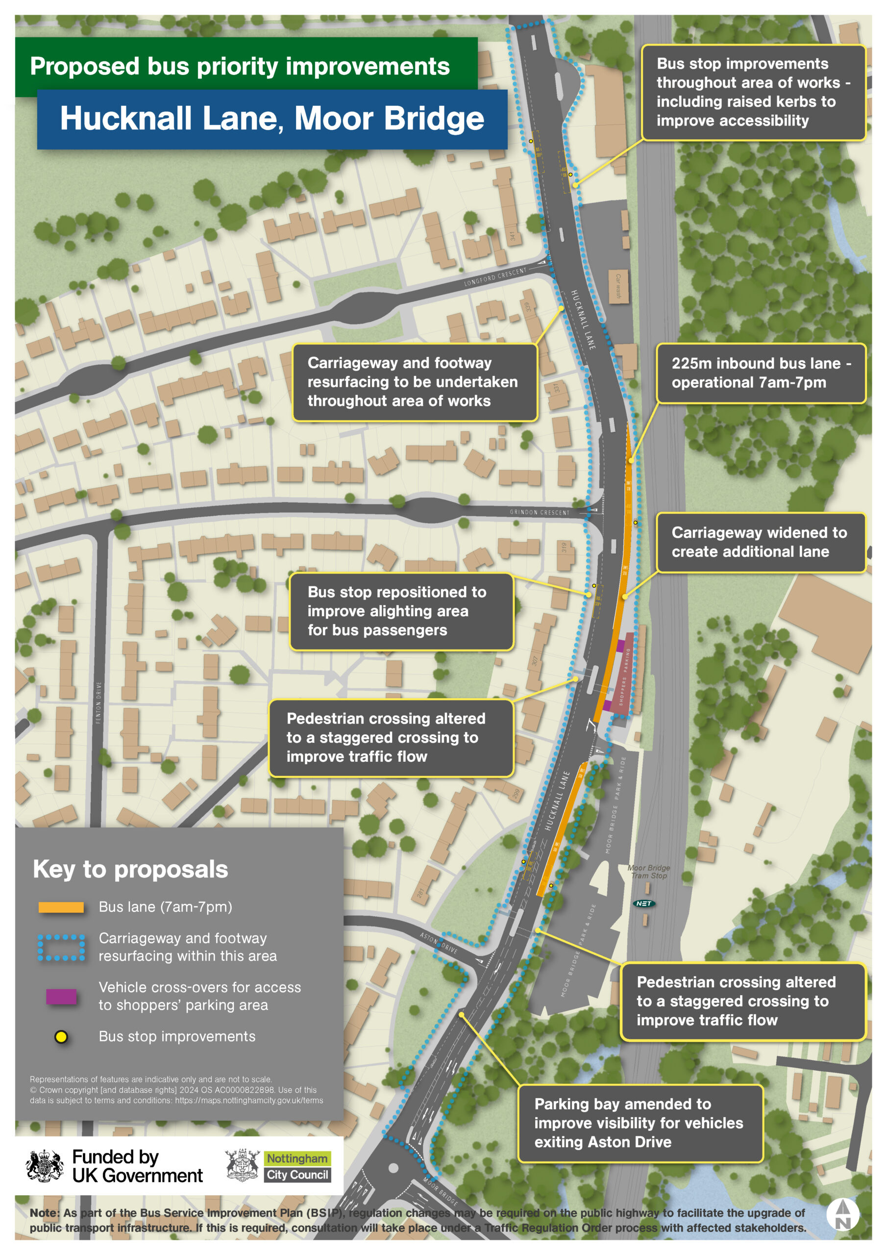 Following a reappraisal of this scheme, which originally included removal of the Moor Bridge traffic island and traffic light signalisation at the junction, we have gathered comments on new proposals for an inbound bus lane on the A611 / Hucknall Lane, alongside improvements for pedestrians, accessibility improvements at local bus stops and full carriageway resurfacing for all road users.